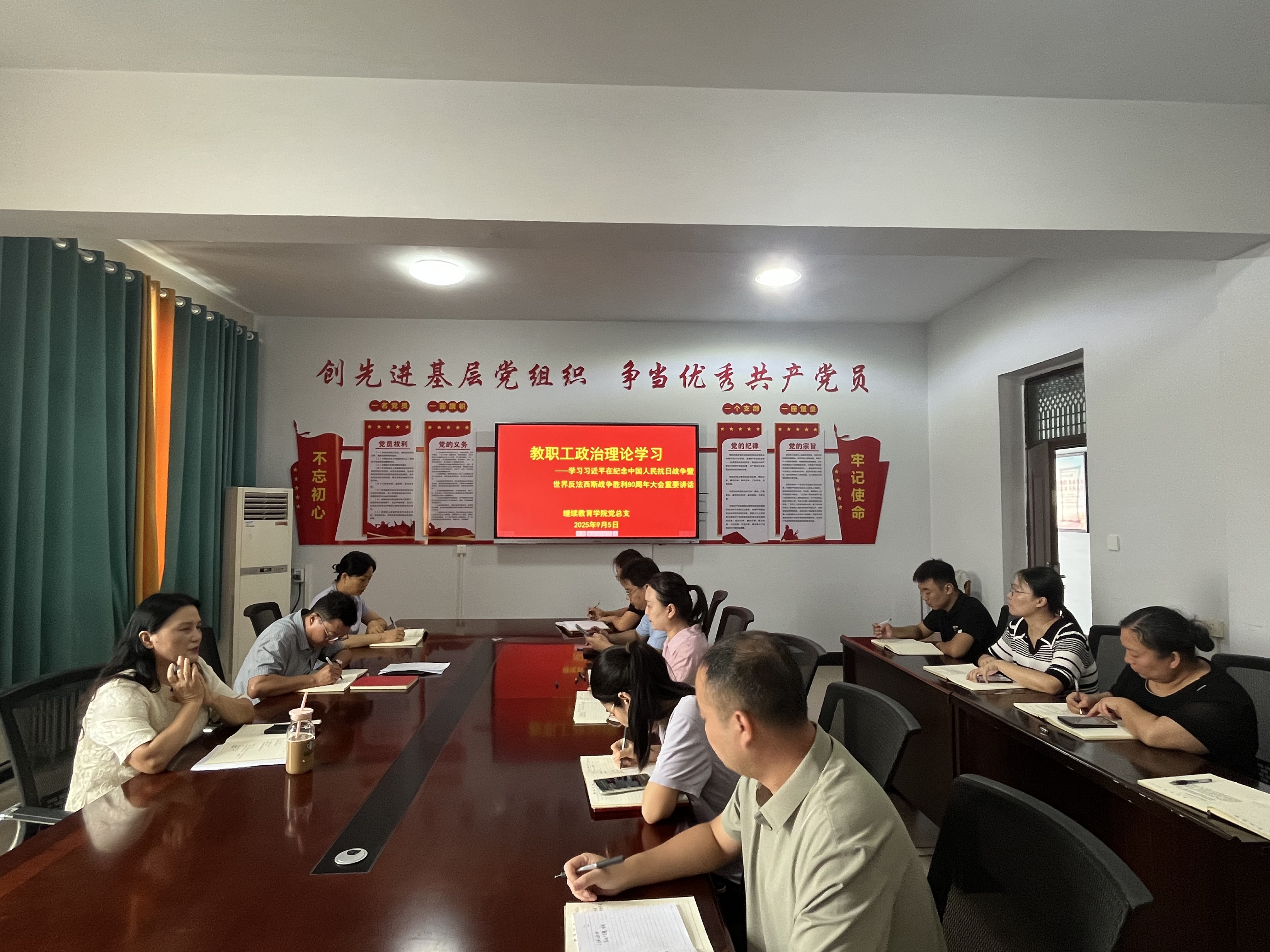 9月5日,公司党总支组织全体教职工进行政治理论学习,学习习近平在纪念中国人民抗日战争暨世界反法西斯战争胜利80周年大会重要讲话。牛月翰主持会议。