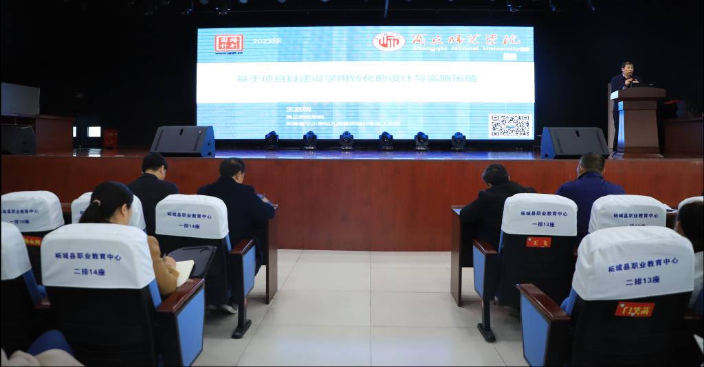 为进一步提升教师专业素养和学用转化能力,王启明教授为柘城县“三名”工作室全体成员做了《基于项目县建设学用转化的设计与实施策略》的专项指导报告,分别从“学习共同体”和“校本研修”两大主题阐述学用转化过程中存在的问题及实施的策略。学习共同体学用转化实施的关键在于“三名”工作室的引领,通过梳理集中培训收获点,确定学以致用应用点;对于实现校本研修活动的真实发生,教研组长的策划、组织、引领、示范、指导能力至关重要。他在报告中指出,校本研修的四要素为专家引领、任务驱动、同伴互助以及自我反思。