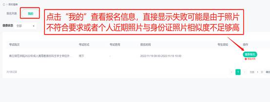 9.查看报名信息:若显示报名失败,则可能是上传的照片不符合要求或者个人证件照片与身份证照片相似度不足够高(照片不符合要求需要点击重新报名并上传符合要求的照片,如果是因为个人相貌有变化则等待审核即可);审核成功后会显示报名成功。